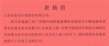 近日,公司總承包的廣西柳州鋼鐵集團(tuán)鎳鐵冶煉項(xiàng)目公輔設(shè)施系統(tǒng)廢水處理及雨水收集工程項(xiàng)目部收到業(yè)主表揚(yáng)信,稱贊項(xiàng)目部在安全、...